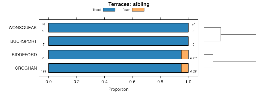 Geomorphic description summaries for the MOOSABEC series and siblings. Series are sorted according to hierarchical clustering of proportions and relative hydrologic position within an idealized landform (e.g. top to bottom). Most soil series (SSURGO components) are associated with a hillslope position and one or more landform-specific positions: hills, mountain slopes, terraces, and/or flats. Proportions can be interpreted as an aggregate representation of geomorphic membership. The values printed to the left (number of component records) and right (Shannon entropy) of stacked bars can be used to judge the reliability of trends. Small Shannon entropy values suggest relatively consistent geomorphic association, while larger values suggest lack thereof. Source: SSURGO component records .