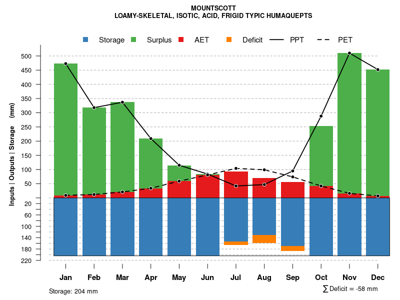 Monthly water balance estimated using a leaky-bucket style model for the MOUNTSCOTT soil series. Monthly precipitation (PPT) and potential evapotranspiration (PET) have been estimated from the 50th percentile of gridded values (PRISM 1981-2010) overlapping with the extent of SSURGO map units containing each series as a major component. Monthly PET values were estimated using the method of Thornthwaite (1948). These (and other) climatic parameters are calculated with each SSURGO refresh and provided by the fetchOSD function of the soilDB package. Representative water storage values (“AWC” in the figures) were derived from SSURGO by taking the 50th percentile of profile-total water storage (sum[awc_r * horizon thickness]) for each soil series. Note that this representation of “water storage” is based on the average ability of most plants to extract soil water between 15 bar (“permanent wilting point”) and 1/3 bar (“field capacity”) matric potential. Soil moisture state can be roughly interpreted as “dry” when storage is depleted, “moist” when storage is between 0mm and AWC, and “wet” when there is a surplus. Clearly there are a lot of assumptions baked into this kind of monthly water balance. This is still a work in progress.