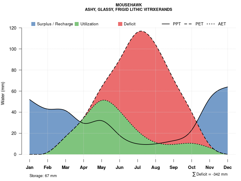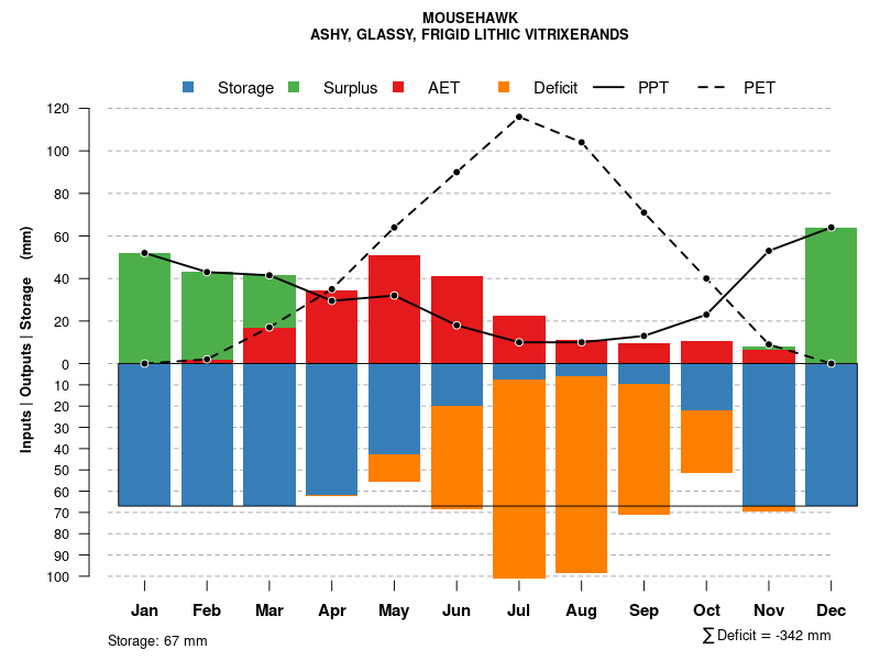 Monthly water balance estimated using a leaky-bucket style model for the MOUSEHAWK soil series. Monthly precipitation (PPT) and potential evapotranspiration (PET) have been estimated from the 50th percentile of gridded values (PRISM 1981-2010) overlapping with the extent of SSURGO map units containing each series as a major component. Monthly PET values were estimated using the method of Thornthwaite (1948). These (and other) climatic parameters are calculated with each SSURGO refresh and provided by the fetchOSD function of the soilDB package. Representative water storage values (“AWC” in the figures) were derived from SSURGO by taking the 50th percentile of profile-total water storage (sum[awc_r * horizon thickness]) for each soil series. Note that this representation of “water storage” is based on the average ability of most plants to extract soil water between 15 bar (“permanent wilting point”) and 1/3 bar (“field capacity”) matric potential. Soil moisture state can be roughly interpreted as “dry” when storage is depleted, “moist” when storage is between 0mm and AWC, and “wet” when there is a surplus. Clearly there are a lot of assumptions baked into this kind of monthly water balance. This is still a work in progress.