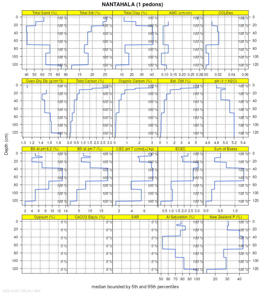 Aggregate lab data for the NANTAHALA soil series. This aggregation is based on all pedons with a current taxon name of NANTAHALA, and applied along 1-cm thick depth slices. Solid lines are the slice-wise median, bounded on either side by the interval defined by the slice-wise 5th and 95th percentiles. The median is the value that splits the data in half. Five percent of the data are less than the 5th percentile, and five percent of the data are greater than the 95th percentile. Values along the right hand side y-axis describe the proportion of pedon data that contribute to aggregate values at this depth. For example, a value of "90%" at 25cm means that 90% of the pedons correlated to NANTAHALA were used in the calculation. Source: KSSL snapshot . Methods used to assemble the KSSL snapshot used by SoilWeb / SDE