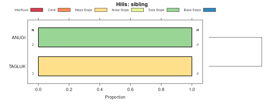 Geomorphic description summaries for the NIAKUK series and siblings. Series are sorted according to hierarchical clustering of proportions and relative hydrologic position within an idealized landform (e.g. top to bottom). Most soil series (SSURGO components) are associated with a hillslope position and one or more landform-specific positions: hills, mountain slopes, terraces, and/or flats. Proportions can be interpreted as an aggregate representation of geomorphic membership. The values printed to the left (number of component records) and right (Shannon entropy) of stacked bars can be used to judge the reliability of trends. Small Shannon entropy values suggest relatively consistent geomorphic association, while larger values suggest lack thereof. Source: SSURGO component records .