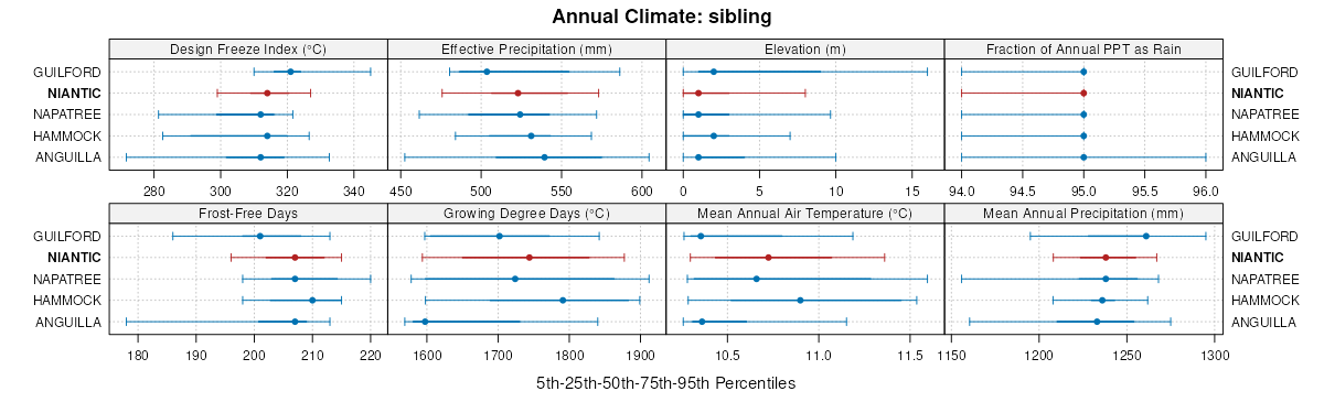 Select annual climate data summaries for the NIANTIC series and competing. Series are sorted according to hierarchical clustering of median values. Source: SSURGO map unit geometry and 1981-2010, 800m PRISM data .