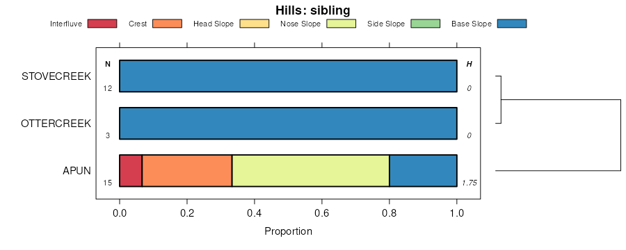 Geomorphic description summaries for the NIILGIK series and siblings. Series are sorted according to hierarchical clustering of proportions and relative hydrologic position within an idealized landform (e.g. top to bottom). Most soil series (SSURGO components) are associated with a hillslope position and one or more landform-specific positions: hills, mountain slopes, terraces, and/or flats. Proportions can be interpreted as an aggregate representation of geomorphic membership. The values printed to the left (number of component records) and right (Shannon entropy) of stacked bars can be used to judge the reliability of trends. Small Shannon entropy values suggest relatively consistent geomorphic association, while larger values suggest lack thereof. Source: SSURGO component records .