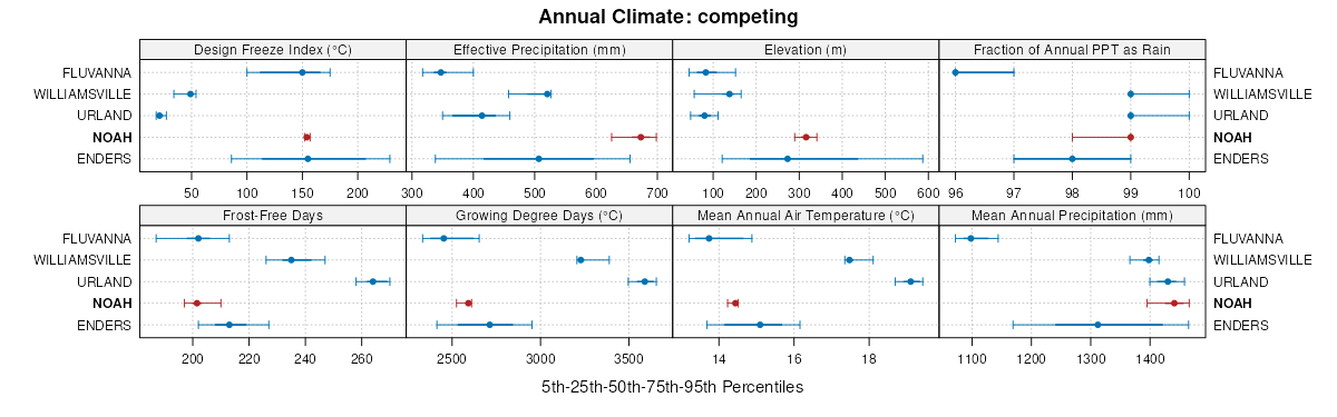 Select annual climate data summaries for the NOAH series and competing. Series are sorted according to hierarchical clustering of median values. Source: SSURGO map unit geometry and 1981-2010, 800m PRISM data .