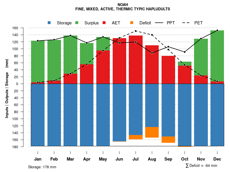 Monthly water balance estimated using a leaky-bucket style model for the NOAH soil series. Monthly precipitation (PPT) and potential evapotranspiration (PET) have been estimated from the 50th percentile of gridded values (PRISM 1981-2010) overlapping with the extent of SSURGO map units containing each series as a major component. Monthly PET values were estimated using the method of Thornthwaite (1948). These (and other) climatic parameters are calculated with each SSURGO refresh and provided by the fetchOSD function of the soilDB package. Representative water storage values (“AWC” in the figures) were derived from SSURGO by taking the 50th percentile of profile-total water storage (sum[awc_r * horizon thickness]) for each soil series. Note that this representation of “water storage” is based on the average ability of most plants to extract soil water between 15 bar (“permanent wilting point”) and 1/3 bar (“field capacity”) matric potential. Soil moisture state can be roughly interpreted as “dry” when storage is depleted, “moist” when storage is between 0mm and AWC, and “wet” when there is a surplus. Clearly there are a lot of assumptions baked into this kind of monthly water balance. This is still a work in progress.