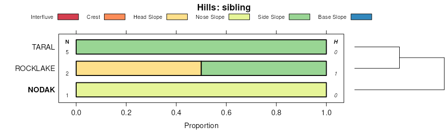 Geomorphic description summaries for the NODAK series and siblings. Series are sorted according to hierarchical clustering of proportions and relative hydrologic position within an idealized landform (e.g. top to bottom). Most soil series (SSURGO components) are associated with a hillslope position and one or more landform-specific positions: hills, mountain slopes, terraces, and/or flats. Proportions can be interpreted as an aggregate representation of geomorphic membership. The values printed to the left (number of component records) and right (Shannon entropy) of stacked bars can be used to judge the reliability of trends. Small Shannon entropy values suggest relatively consistent geomorphic association, while larger values suggest lack thereof. Source: SSURGO component records .