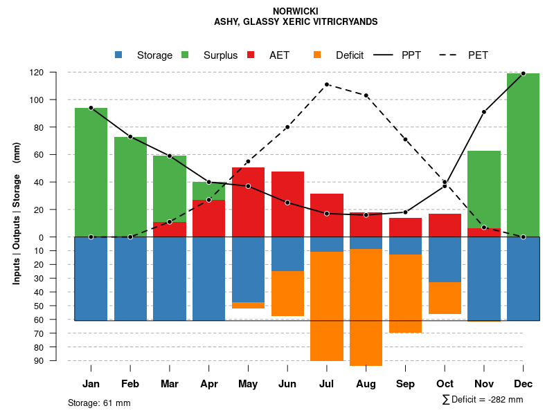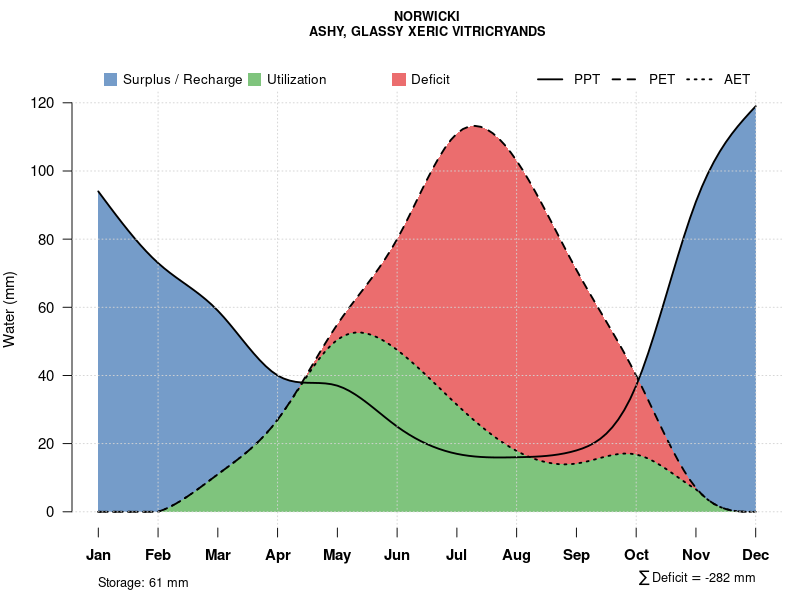 Monthly water balance estimated using a leaky-bucket style model for the NORWICKI soil series. Monthly precipitation (PPT) and potential evapotranspiration (PET) have been estimated from the 50th percentile of gridded values (PRISM 1981-2010) overlapping with the extent of SSURGO map units containing each series as a major component. Monthly PET values were estimated using the method of Thornthwaite (1948). These (and other) climatic parameters are calculated with each SSURGO refresh and provided by the fetchOSD function of the soilDB package. Representative water storage values (“AWC” in the figures) were derived from SSURGO by taking the 50th percentile of profile-total water storage (sum[awc_r * horizon thickness]) for each soil series. Note that this representation of “water storage” is based on the average ability of most plants to extract soil water between 15 bar (“permanent wilting point”) and 1/3 bar (“field capacity”) matric potential. Soil moisture state can be roughly interpreted as “dry” when storage is depleted, “moist” when storage is between 0mm and AWC, and “wet” when there is a surplus. Clearly there are a lot of assumptions baked into this kind of monthly water balance. This is still a work in progress.