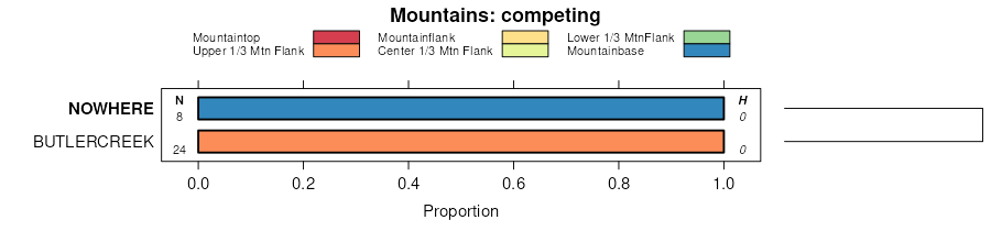 Geomorphic description summaries for the NOWHERE series and competing. Series are sorted according to hierarchical clustering of proportions and relative hydrologic position within an idealized landform (e.g. top to bottom). Proportions can be interpreted as an aggregate representation of geomorphic membership. Most soil series (SSURGO components) are associated with a hillslope position and one or more landform-specific positions: hills, mountain slopes, terraces, and/or flats. The values printed to the left (number of component records) and right (Shannon entropy) of stacked bars can be used to judge the reliability of trends. Shannon entropy values close to 0 represent soil series with relatively consistent geomorphic association, while values close to 1 suggest lack thereof. Source: SSURGO component records .