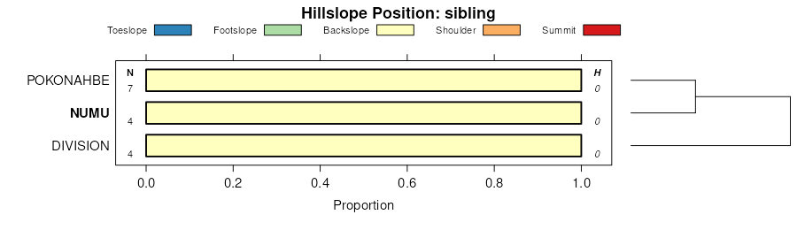 Geomorphic description summaries for the NUMU series and siblings. Series are sorted according to hierarchical clustering of proportions and relative hydrologic position within an idealized landform (e.g. top to bottom). Most soil series (SSURGO components) are associated with a hillslope position and one or more landform-specific positions: hills, mountain slopes, terraces, and/or flats. Proportions can be interpreted as an aggregate representation of geomorphic membership. The values printed to the left (number of component records) and right (Shannon entropy) of stacked bars can be used to judge the reliability of trends. Small Shannon entropy values suggest relatively consistent geomorphic association, while larger values suggest lack thereof. Source: SSURGO component records .