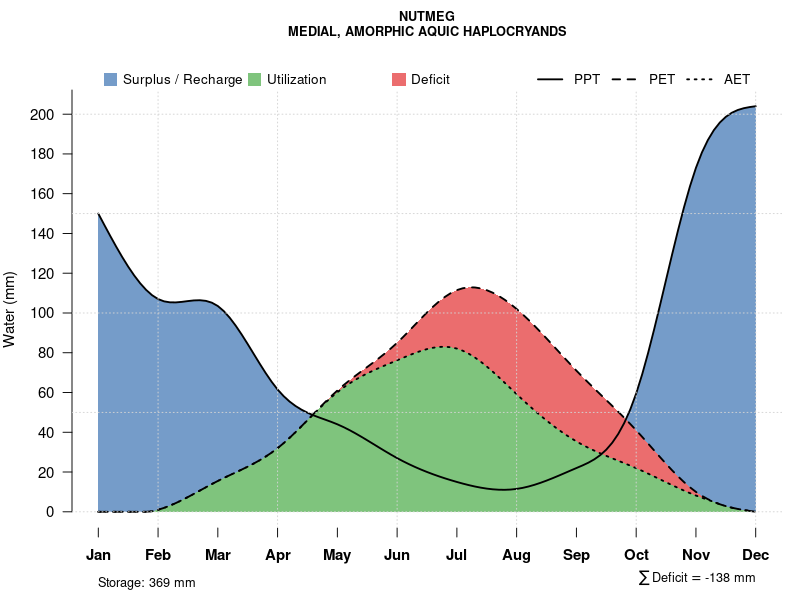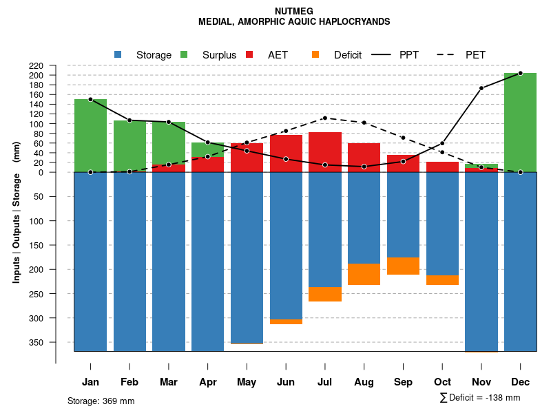 Monthly water balance estimated using a leaky-bucket style model for the NUTMEG soil series. Monthly precipitation (PPT) and potential evapotranspiration (PET) have been estimated from the 50th percentile of gridded values (PRISM 1981-2010) overlapping with the extent of SSURGO map units containing each series as a major component. Monthly PET values were estimated using the method of Thornthwaite (1948). These (and other) climatic parameters are calculated with each SSURGO refresh and provided by the fetchOSD function of the soilDB package. Representative water storage values (“AWC” in the figures) were derived from SSURGO by taking the 50th percentile of profile-total water storage (sum[awc_r * horizon thickness]) for each soil series. Note that this representation of “water storage” is based on the average ability of most plants to extract soil water between 15 bar (“permanent wilting point”) and 1/3 bar (“field capacity”) matric potential. Soil moisture state can be roughly interpreted as “dry” when storage is depleted, “moist” when storage is between 0mm and AWC, and “wet” when there is a surplus. Clearly there are a lot of assumptions baked into this kind of monthly water balance. This is still a work in progress.