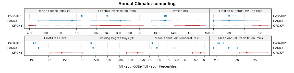Select annual climate data summaries for the ORCKY series and competing. Series are sorted according to hierarchical clustering of median values. Source: SSURGO map unit geometry and 1981-2010, 800m PRISM data .