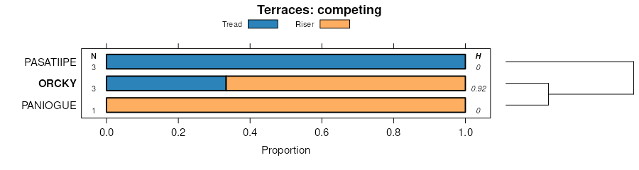 Geomorphic description summaries for the ORCKY series and competing. Series are sorted according to hierarchical clustering of proportions and relative hydrologic position within an idealized landform (e.g. top to bottom). Proportions can be interpreted as an aggregate representation of geomorphic membership. Most soil series (SSURGO components) are associated with a hillslope position and one or more landform-specific positions: hills, mountain slopes, terraces, and/or flats. The values printed to the left (number of component records) and right (Shannon entropy) of stacked bars can be used to judge the reliability of trends. Shannon entropy values close to 0 represent soil series with relatively consistent geomorphic association, while values close to 1 suggest lack thereof. Source: SSURGO component records .