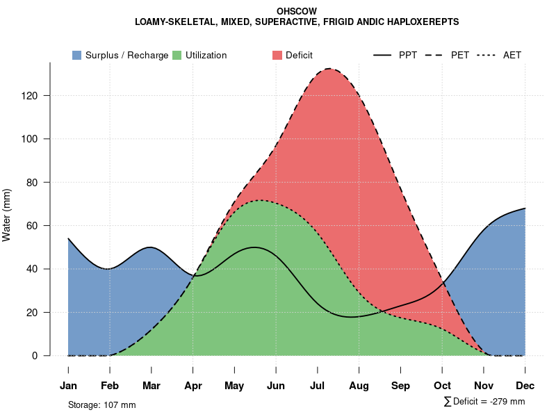Monthly water balance estimated using a leaky-bucket style model for the OHSCOW soil series. Monthly precipitation (PPT) and potential evapotranspiration (PET) have been estimated from the 50th percentile of gridded values (PRISM 1981-2010) overlapping with the extent of SSURGO map units containing each series as a major component. Monthly PET values were estimated using the method of Thornthwaite (1948). These (and other) climatic parameters are calculated with each SSURGO refresh and provided by the fetchOSD function of the soilDB package. Representative water storage values (“AWC” in the figures) were derived from SSURGO by taking the 50th percentile of profile-total water storage (sum[awc_r * horizon thickness]) for each soil series. Note that this representation of “water storage” is based on the average ability of most plants to extract soil water between 15 bar (“permanent wilting point”) and 1/3 bar (“field capacity”) matric potential. Soil moisture state can be roughly interpreted as “dry” when storage is depleted, “moist” when storage is between 0mm and AWC, and “wet” when there is a surplus. Clearly there are a lot of assumptions baked into this kind of monthly water balance. This is still a work in progress.
