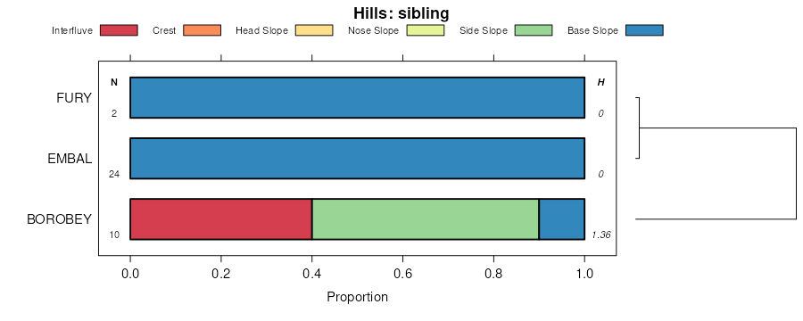 Geomorphic description summaries for the OPIE series and siblings. Series are sorted according to hierarchical clustering of proportions and relative hydrologic position within an idealized landform (e.g. top to bottom). Most soil series (SSURGO components) are associated with a hillslope position and one or more landform-specific positions: hills, mountain slopes, terraces, and/or flats. Proportions can be interpreted as an aggregate representation of geomorphic membership. The values printed to the left (number of component records) and right (Shannon entropy) of stacked bars can be used to judge the reliability of trends. Small Shannon entropy values suggest relatively consistent geomorphic association, while larger values suggest lack thereof. Source: SSURGO component records .