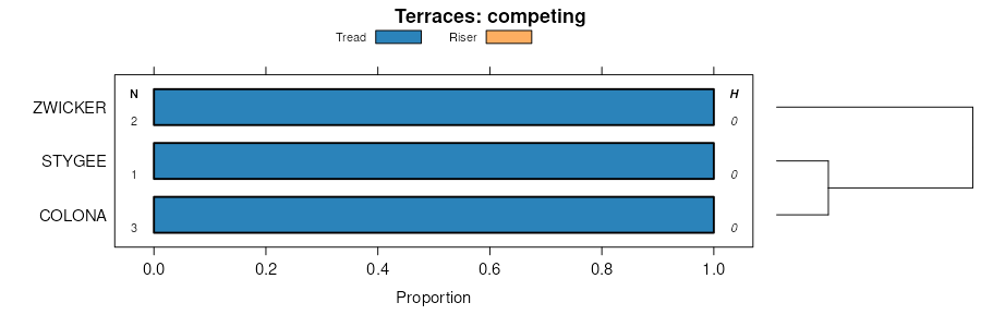 Geomorphic description summaries for the PUERCO series and competing. Series are sorted according to hierarchical clustering of proportions and relative hydrologic position within an idealized landform (e.g. top to bottom). Proportions can be interpreted as an aggregate representation of geomorphic membership. Most soil series (SSURGO components) are associated with a hillslope position and one or more landform-specific positions: hills, mountain slopes, terraces, and/or flats. The values printed to the left (number of component records) and right (Shannon entropy) of stacked bars can be used to judge the reliability of trends. Shannon entropy values close to 0 represent soil series with relatively consistent geomorphic association, while values close to 1 suggest lack thereof. Source: SSURGO component records .