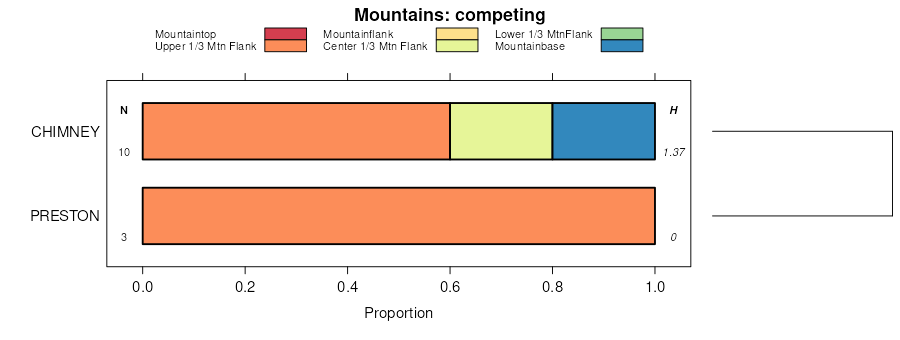 Geomorphic description summaries for the PANAMAKER series and siblings. Series are sorted according to hierarchical clustering of proportions and relative hydrologic position within an idealized landform (e.g. top to bottom). Most soil series (SSURGO components) are associated with a hillslope position and one or more landform-specific positions: hills, mountain slopes, terraces, and/or flats. Proportions can be interpreted as an aggregate representation of geomorphic membership. The values printed to the left (number of component records) and right (Shannon entropy) of stacked bars can be used to judge the reliability of trends. Small Shannon entropy values suggest relatively consistent geomorphic association, while larger values suggest lack thereof. Source: SSURGO component records .