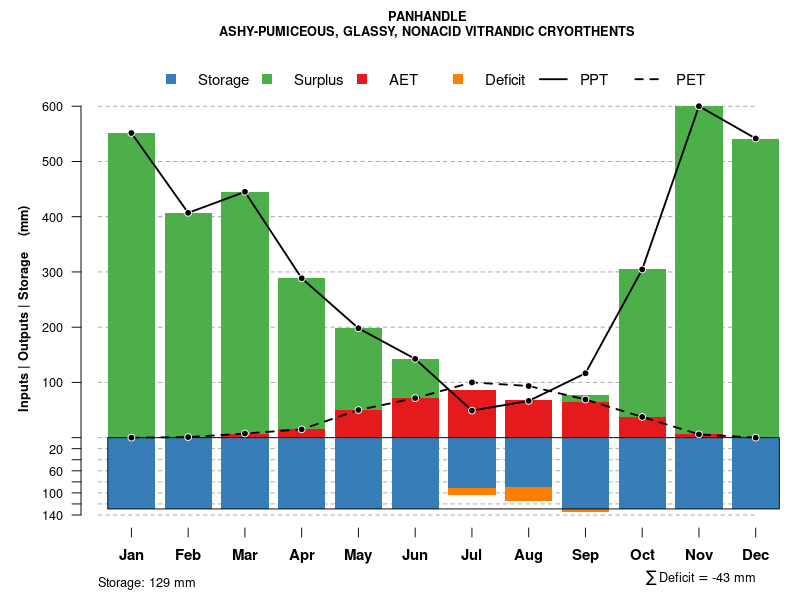 Monthly water balance estimated using a leaky-bucket style model for the PANHANDLE soil series. Monthly precipitation (PPT) and potential evapotranspiration (PET) have been estimated from the 50th percentile of gridded values (PRISM 1981-2010) overlapping with the extent of SSURGO map units containing each series as a major component. Monthly PET values were estimated using the method of Thornthwaite (1948). These (and other) climatic parameters are calculated with each SSURGO refresh and provided by the fetchOSD function of the soilDB package. Representative water storage values (“AWC” in the figures) were derived from SSURGO by taking the 50th percentile of profile-total water storage (sum[awc_r * horizon thickness]) for each soil series. Note that this representation of “water storage” is based on the average ability of most plants to extract soil water between 15 bar (“permanent wilting point”) and 1/3 bar (“field capacity”) matric potential. Soil moisture state can be roughly interpreted as “dry” when storage is depleted, “moist” when storage is between 0mm and AWC, and “wet” when there is a surplus. Clearly there are a lot of assumptions baked into this kind of monthly water balance. This is still a work in progress.