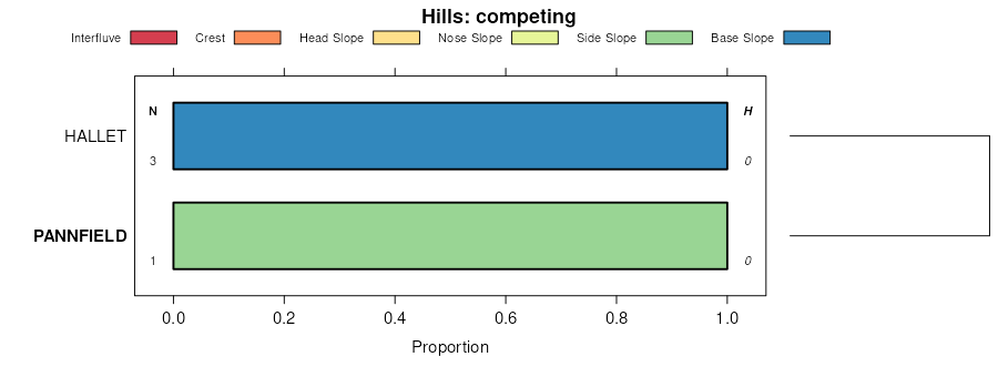 Geomorphic description summaries for the PANNFIELD series and competing. Series are sorted according to hierarchical clustering of proportions and relative hydrologic position within an idealized landform (e.g. top to bottom). Proportions can be interpreted as an aggregate representation of geomorphic membership. Most soil series (SSURGO components) are associated with a hillslope position and one or more landform-specific positions: hills, mountain slopes, terraces, and/or flats. The values printed to the left (number of component records) and right (Shannon entropy) of stacked bars can be used to judge the reliability of trends. Shannon entropy values close to 0 represent soil series with relatively consistent geomorphic association, while values close to 1 suggest lack thereof. Source: SSURGO component records .