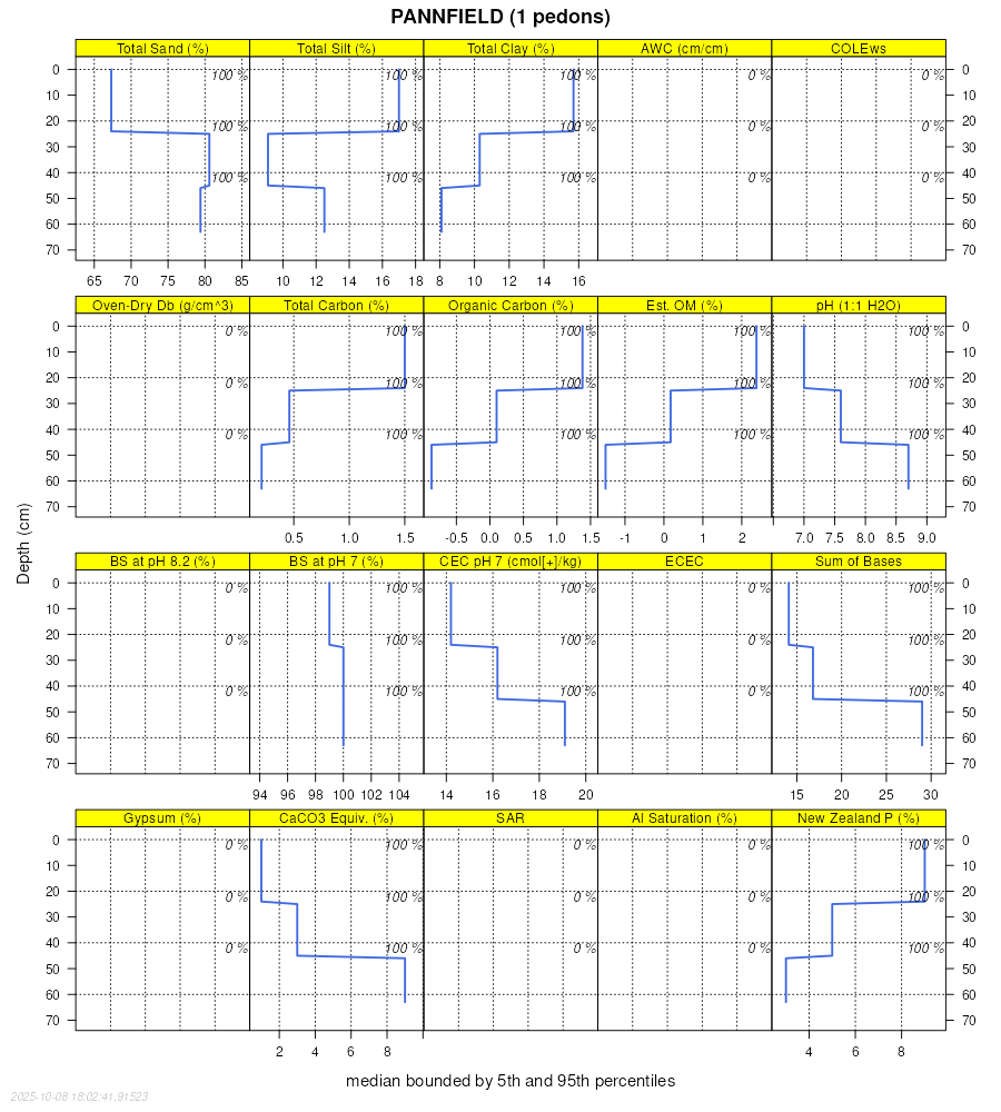 Aggregate lab data for the PANNFIELD soil series. This aggregation is based on all pedons with a current taxon name of PANNFIELD, and applied along 1-cm thick depth slices. Solid lines are the slice-wise median, bounded on either side by the interval defined by the slice-wise 5th and 95th percentiles. The median is the value that splits the data in half. Five percent of the data are less than the 5th percentile, and five percent of the data are greater than the 95th percentile. Values along the right hand side y-axis describe the proportion of pedon data that contribute to aggregate values at this depth. For example, a value of "90%" at 25cm means that 90% of the pedons correlated to PANNFIELD were used in the calculation. Source: KSSL snapshot . Methods used to assemble the KSSL snapshot used by SoilWeb / SDE
