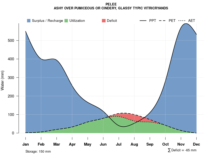 Monthly water balance estimated using a leaky-bucket style model for the PELEE soil series. Monthly precipitation (PPT) and potential evapotranspiration (PET) have been estimated from the 50th percentile of gridded values (PRISM 1981-2010) overlapping with the extent of SSURGO map units containing each series as a major component. Monthly PET values were estimated using the method of Thornthwaite (1948). These (and other) climatic parameters are calculated with each SSURGO refresh and provided by the fetchOSD function of the soilDB package. Representative water storage values (“AWC” in the figures) were derived from SSURGO by taking the 50th percentile of profile-total water storage (sum[awc_r * horizon thickness]) for each soil series. Note that this representation of “water storage” is based on the average ability of most plants to extract soil water between 15 bar (“permanent wilting point”) and 1/3 bar (“field capacity”) matric potential. Soil moisture state can be roughly interpreted as “dry” when storage is depleted, “moist” when storage is between 0mm and AWC, and “wet” when there is a surplus. Clearly there are a lot of assumptions baked into this kind of monthly water balance. This is still a work in progress.