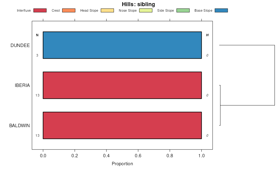 Geomorphic description summaries for the PERRY series and siblings. Series are sorted according to hierarchical clustering of proportions and relative hydrologic position within an idealized landform (e.g. top to bottom). Most soil series (SSURGO components) are associated with a hillslope position and one or more landform-specific positions: hills, mountain slopes, terraces, and/or flats. Proportions can be interpreted as an aggregate representation of geomorphic membership. The values printed to the left (number of component records) and right (Shannon entropy) of stacked bars can be used to judge the reliability of trends. Small Shannon entropy values suggest relatively consistent geomorphic association, while larger values suggest lack thereof. Source: SSURGO component records .