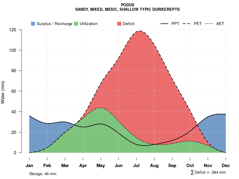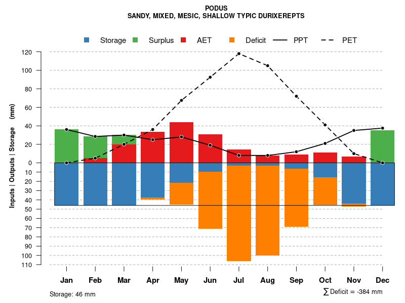 Monthly water balance estimated using a leaky-bucket style model for the PODUS soil series. Monthly precipitation (PPT) and potential evapotranspiration (PET) have been estimated from the 50th percentile of gridded values (PRISM 1981-2010) overlapping with the extent of SSURGO map units containing each series as a major component. Monthly PET values were estimated using the method of Thornthwaite (1948). These (and other) climatic parameters are calculated with each SSURGO refresh and provided by the fetchOSD function of the soilDB package. Representative water storage values (“AWC” in the figures) were derived from SSURGO by taking the 50th percentile of profile-total water storage (sum[awc_r * horizon thickness]) for each soil series. Note that this representation of “water storage” is based on the average ability of most plants to extract soil water between 15 bar (“permanent wilting point”) and 1/3 bar (“field capacity”) matric potential. Soil moisture state can be roughly interpreted as “dry” when storage is depleted, “moist” when storage is between 0mm and AWC, and “wet” when there is a surplus. Clearly there are a lot of assumptions baked into this kind of monthly water balance. This is still a work in progress.