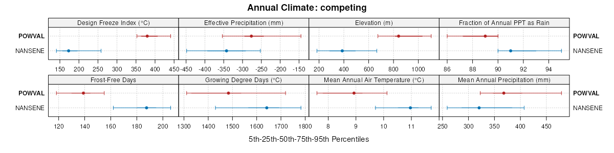 Select annual climate data summaries for the POWVAL series and competing. Series are sorted according to hierarchical clustering of median values. Source: SSURGO map unit geometry and 1981-2010, 800m PRISM data .