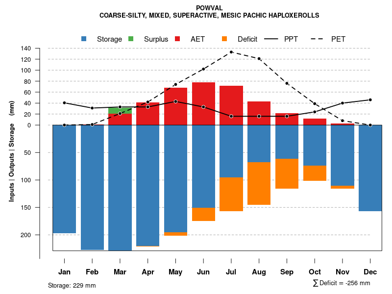 Monthly water balance estimated using a leaky-bucket style model for the POWVAL soil series. Monthly precipitation (PPT) and potential evapotranspiration (PET) have been estimated from the 50th percentile of gridded values (PRISM 1981-2010) overlapping with the extent of SSURGO map units containing each series as a major component. Monthly PET values were estimated using the method of Thornthwaite (1948). These (and other) climatic parameters are calculated with each SSURGO refresh and provided by the fetchOSD function of the soilDB package. Representative water storage values (“AWC” in the figures) were derived from SSURGO by taking the 50th percentile of profile-total water storage (sum[awc_r * horizon thickness]) for each soil series. Note that this representation of “water storage” is based on the average ability of most plants to extract soil water between 15 bar (“permanent wilting point”) and 1/3 bar (“field capacity”) matric potential. Soil moisture state can be roughly interpreted as “dry” when storage is depleted, “moist” when storage is between 0mm and AWC, and “wet” when there is a surplus. Clearly there are a lot of assumptions baked into this kind of monthly water balance. This is still a work in progress.