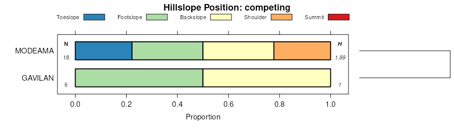 Geomorphic description summaries for the PROCKY series and siblings. Series are sorted according to hierarchical clustering of proportions and relative hydrologic position within an idealized landform (e.g. top to bottom). Most soil series (SSURGO components) are associated with a hillslope position and one or more landform-specific positions: hills, mountain slopes, terraces, and/or flats. Proportions can be interpreted as an aggregate representation of geomorphic membership. The values printed to the left (number of component records) and right (Shannon entropy) of stacked bars can be used to judge the reliability of trends. Small Shannon entropy values suggest relatively consistent geomorphic association, while larger values suggest lack thereof. Source: SSURGO component records .