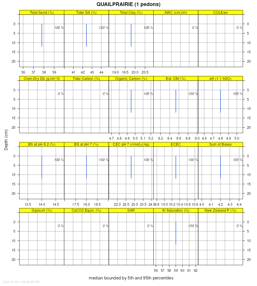 Aggregate lab data for the QUAILPRAIRIE soil series. This aggregation is based on all pedons with a current taxon name of QUAILPRAIRIE, and applied along 1-cm thick depth slices. Solid lines are the slice-wise median, bounded on either side by the interval defined by the slice-wise 5th and 95th percentiles. The median is the value that splits the data in half. Five percent of the data are less than the 5th percentile, and five percent of the data are greater than the 95th percentile. Values along the right hand side y-axis describe the proportion of pedon data that contribute to aggregate values at this depth. For example, a value of "90%" at 25cm means that 90% of the pedons correlated to QUAILPRAIRIE were used in the calculation. Source: KSSL snapshot . Methods used to assemble the KSSL snapshot used by SoilWeb / SDE