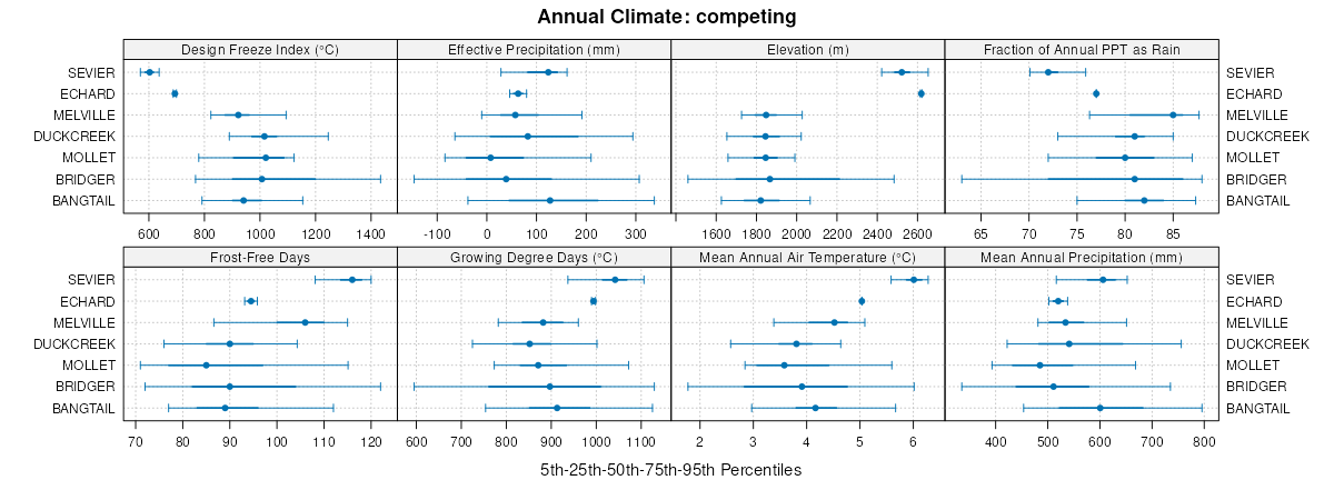 Select annual climate data summaries for the RATTLER series and competing. Series are sorted according to hierarchical clustering of median values. Source: SSURGO map unit geometry and 1981-2010, 800m PRISM data .