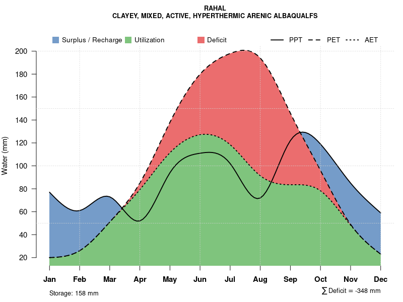 Monthly water balance estimated using a leaky-bucket style model for the RAHAL soil series. Monthly precipitation (PPT) and potential evapotranspiration (PET) have been estimated from the 50th percentile of gridded values (PRISM 1981-2010) overlapping with the extent of SSURGO map units containing each series as a major component. Monthly PET values were estimated using the method of Thornthwaite (1948). These (and other) climatic parameters are calculated with each SSURGO refresh and provided by the fetchOSD function of the soilDB package. Representative water storage values (“AWC” in the figures) were derived from SSURGO by taking the 50th percentile of profile-total water storage (sum[awc_r * horizon thickness]) for each soil series. Note that this representation of “water storage” is based on the average ability of most plants to extract soil water between 15 bar (“permanent wilting point”) and 1/3 bar (“field capacity”) matric potential. Soil moisture state can be roughly interpreted as “dry” when storage is depleted, “moist” when storage is between 0mm and AWC, and “wet” when there is a surplus. Clearly there are a lot of assumptions baked into this kind of monthly water balance. This is still a work in progress.