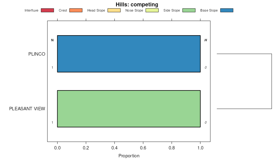 Geomorphic description summaries for the REDOLA series and siblings. Series are sorted according to hierarchical clustering of proportions and relative hydrologic position within an idealized landform (e.g. top to bottom). Most soil series (SSURGO components) are associated with a hillslope position and one or more landform-specific positions: hills, mountain slopes, terraces, and/or flats. Proportions can be interpreted as an aggregate representation of geomorphic membership. The values printed to the left (number of component records) and right (Shannon entropy) of stacked bars can be used to judge the reliability of trends. Small Shannon entropy values suggest relatively consistent geomorphic association, while larger values suggest lack thereof. Source: SSURGO component records .