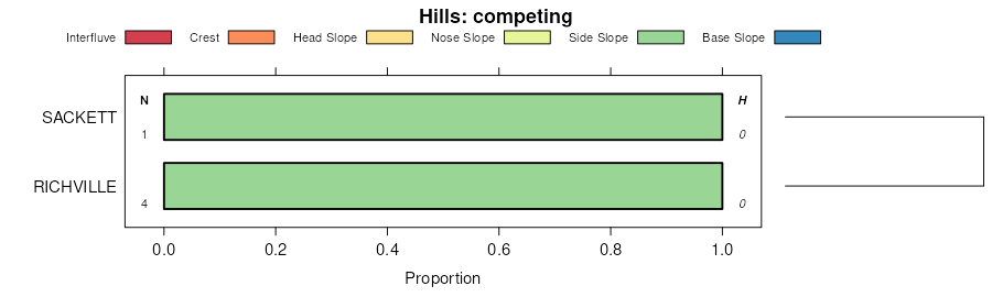 Geomorphic description summaries for the RICHSUM series and competing. Series are sorted according to hierarchical clustering of proportions and relative hydrologic position within an idealized landform (e.g. top to bottom). Proportions can be interpreted as an aggregate representation of geomorphic membership. Most soil series (SSURGO components) are associated with a hillslope position and one or more landform-specific positions: hills, mountain slopes, terraces, and/or flats. The values printed to the left (number of component records) and right (Shannon entropy) of stacked bars can be used to judge the reliability of trends. Shannon entropy values close to 0 represent soil series with relatively consistent geomorphic association, while values close to 1 suggest lack thereof. Source: SSURGO component records .