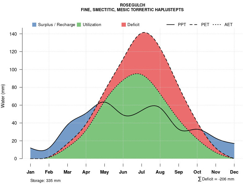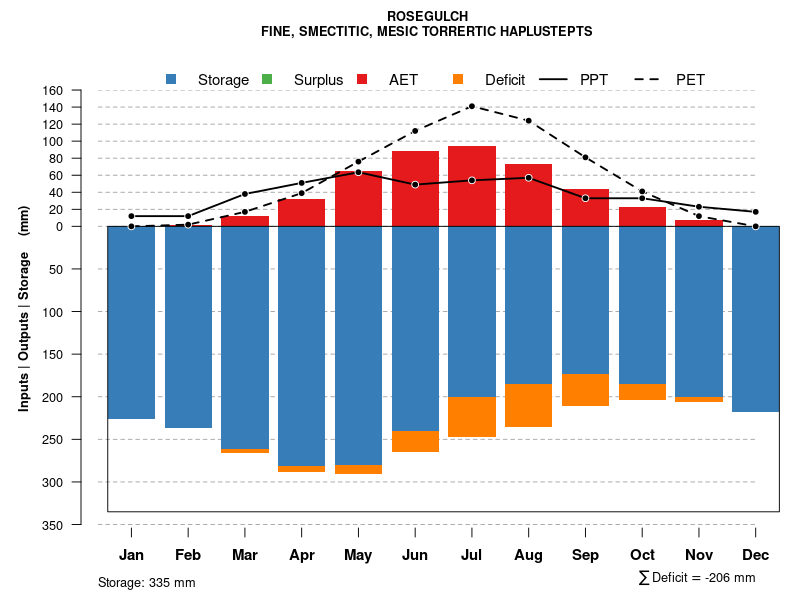 Monthly water balance estimated using a leaky-bucket style model for the ROSEGULCH soil series. Monthly precipitation (PPT) and potential evapotranspiration (PET) have been estimated from the 50th percentile of gridded values (PRISM 1981-2010) overlapping with the extent of SSURGO map units containing each series as a major component. Monthly PET values were estimated using the method of Thornthwaite (1948). These (and other) climatic parameters are calculated with each SSURGO refresh and provided by the fetchOSD function of the soilDB package. Representative water storage values (“AWC” in the figures) were derived from SSURGO by taking the 50th percentile of profile-total water storage (sum[awc_r * horizon thickness]) for each soil series. Note that this representation of “water storage” is based on the average ability of most plants to extract soil water between 15 bar (“permanent wilting point”) and 1/3 bar (“field capacity”) matric potential. Soil moisture state can be roughly interpreted as “dry” when storage is depleted, “moist” when storage is between 0mm and AWC, and “wet” when there is a surplus. Clearly there are a lot of assumptions baked into this kind of monthly water balance. This is still a work in progress.