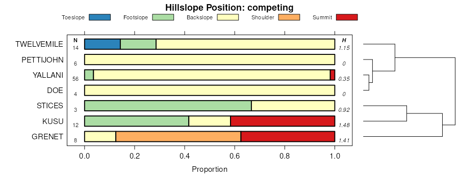 Geomorphic description summaries for the ROUNDKNOLL series and competing. Series are sorted according to hierarchical clustering of proportions and relative hydrologic position within an idealized landform (e.g. top to bottom). Proportions can be interpreted as an aggregate representation of geomorphic membership. Most soil series (SSURGO components) are associated with a hillslope position and one or more landform-specific positions: hills, mountain slopes, terraces, and/or flats. The values printed to the left (number of component records) and right (Shannon entropy) of stacked bars can be used to judge the reliability of trends. Shannon entropy values close to 0 represent soil series with relatively consistent geomorphic association, while values close to 1 suggest lack thereof. Source: SSURGO component records .