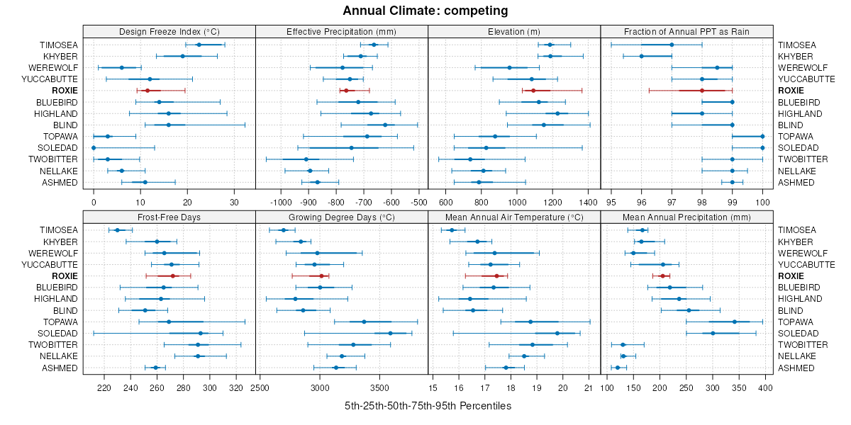 Select annual climate data summaries for the ROXIE series and competing. Series are sorted according to hierarchical clustering of median values. Source: SSURGO map unit geometry and 1981-2010, 800m PRISM data .