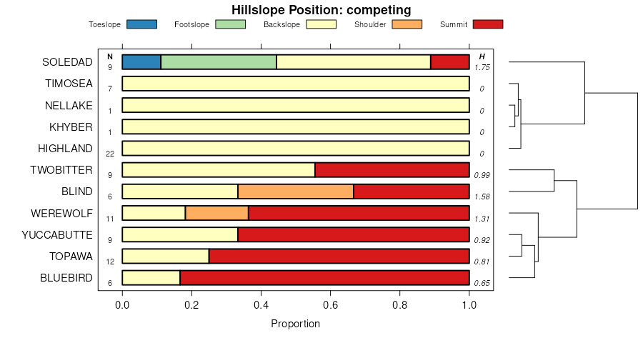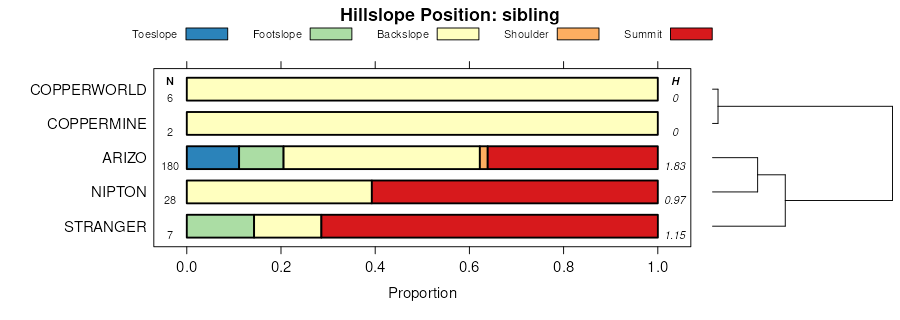 Geomorphic description summaries for the ROXIE series and siblings. Series are sorted according to hierarchical clustering of proportions and relative hydrologic position within an idealized landform (e.g. top to bottom). Most soil series (SSURGO components) are associated with a hillslope position and one or more landform-specific positions: hills, mountain slopes, terraces, and/or flats. Proportions can be interpreted as an aggregate representation of geomorphic membership. The values printed to the left (number of component records) and right (Shannon entropy) of stacked bars can be used to judge the reliability of trends. Small Shannon entropy values suggest relatively consistent geomorphic association, while larger values suggest lack thereof. Source: SSURGO component records .