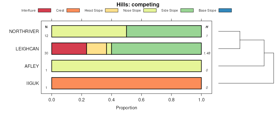 Geomorphic description summaries for the SLEETMUTE series and competing. Series are sorted according to hierarchical clustering of proportions and relative hydrologic position within an idealized landform (e.g. top to bottom). Proportions can be interpreted as an aggregate representation of geomorphic membership. Most soil series (SSURGO components) are associated with a hillslope position and one or more landform-specific positions: hills, mountain slopes, terraces, and/or flats. The values printed to the left (number of component records) and right (Shannon entropy) of stacked bars can be used to judge the reliability of trends. Shannon entropy values close to 0 represent soil series with relatively consistent geomorphic association, while values close to 1 suggest lack thereof. Source: SSURGO component records .
