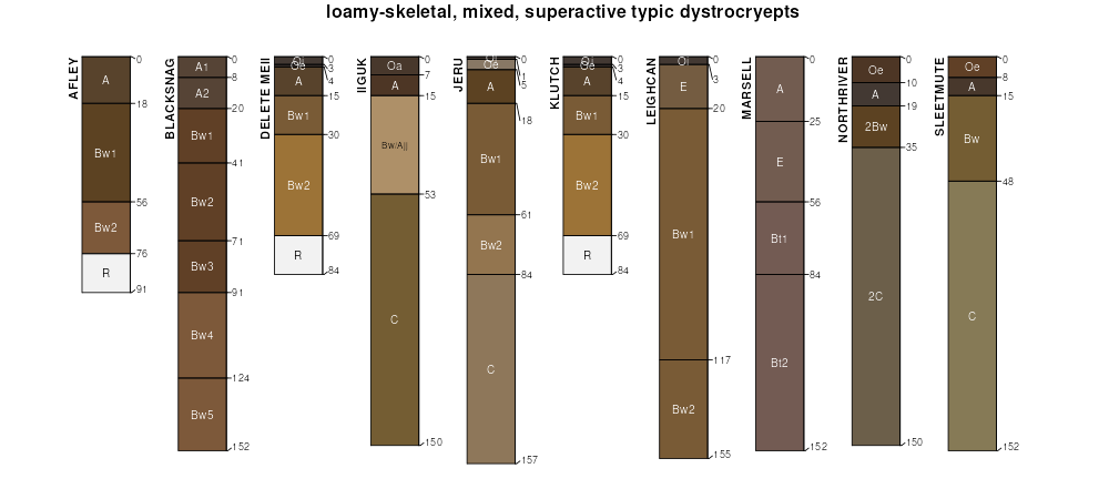 Siblings are those soil series that occur together in map units, in this case with the SLEETMUTE series. Sketches are arranged according to their subgroup-level taxonomic structure. Source: SSURGO snapshot , parsed OSD records and snapshot of SC database .