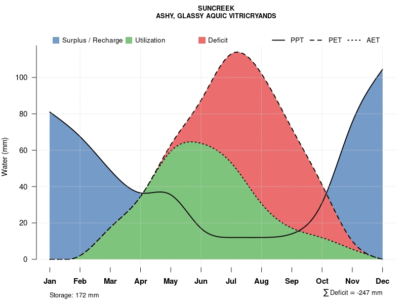 Monthly water balance estimated using a leaky-bucket style model for the SUNCREEK soil series. Monthly precipitation (PPT) and potential evapotranspiration (PET) have been estimated from the 50th percentile of gridded values (PRISM 1981-2010) overlapping with the extent of SSURGO map units containing each series as a major component. Monthly PET values were estimated using the method of Thornthwaite (1948). These (and other) climatic parameters are calculated with each SSURGO refresh and provided by the fetchOSD function of the soilDB package. Representative water storage values (“AWC” in the figures) were derived from SSURGO by taking the 50th percentile of profile-total water storage (sum[awc_r * horizon thickness]) for each soil series. Note that this representation of “water storage” is based on the average ability of most plants to extract soil water between 15 bar (“permanent wilting point”) and 1/3 bar (“field capacity”) matric potential. Soil moisture state can be roughly interpreted as “dry” when storage is depleted, “moist” when storage is between 0mm and AWC, and “wet” when there is a surplus. Clearly there are a lot of assumptions baked into this kind of monthly water balance. This is still a work in progress.