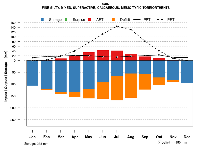 Monthly water balance estimated using a leaky-bucket style model for the SAIN soil series. Monthly precipitation (PPT) and potential evapotranspiration (PET) have been estimated from the 50th percentile of gridded values (PRISM 1981-2010) overlapping with the extent of SSURGO map units containing each series as a major component. Monthly PET values were estimated using the method of Thornthwaite (1948). These (and other) climatic parameters are calculated with each SSURGO refresh and provided by the fetchOSD function of the soilDB package. Representative water storage values (“AWC” in the figures) were derived from SSURGO by taking the 50th percentile of profile-total water storage (sum[awc_r * horizon thickness]) for each soil series. Note that this representation of “water storage” is based on the average ability of most plants to extract soil water between 15 bar (“permanent wilting point”) and 1/3 bar (“field capacity”) matric potential. Soil moisture state can be roughly interpreted as “dry” when storage is depleted, “moist” when storage is between 0mm and AWC, and “wet” when there is a surplus. Clearly there are a lot of assumptions baked into this kind of monthly water balance. This is still a work in progress.