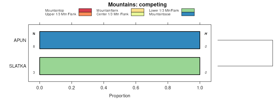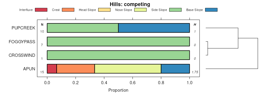Geomorphic description summaries for the SAINTELIAS series and competing. Series are sorted according to hierarchical clustering of proportions and relative hydrologic position within an idealized landform (e.g. top to bottom). Proportions can be interpreted as an aggregate representation of geomorphic membership. Most soil series (SSURGO components) are associated with a hillslope position and one or more landform-specific positions: hills, mountain slopes, terraces, and/or flats. The values printed to the left (number of component records) and right (Shannon entropy) of stacked bars can be used to judge the reliability of trends. Shannon entropy values close to 0 represent soil series with relatively consistent geomorphic association, while values close to 1 suggest lack thereof. Source: SSURGO component records .