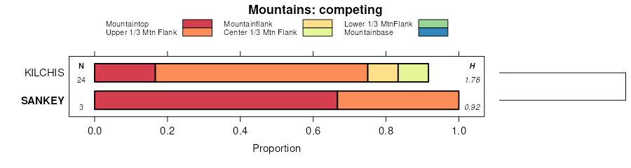 Geomorphic description summaries for the SANKEY series and competing. Series are sorted according to hierarchical clustering of proportions and relative hydrologic position within an idealized landform (e.g. top to bottom). Proportions can be interpreted as an aggregate representation of geomorphic membership. Most soil series (SSURGO components) are associated with a hillslope position and one or more landform-specific positions: hills, mountain slopes, terraces, and/or flats. The values printed to the left (number of component records) and right (Shannon entropy) of stacked bars can be used to judge the reliability of trends. Shannon entropy values close to 0 represent soil series with relatively consistent geomorphic association, while values close to 1 suggest lack thereof. Source: SSURGO component records .