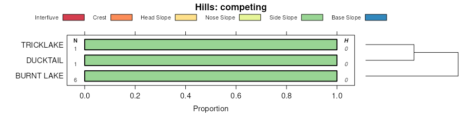 Geomorphic description summaries for the SECONDLAKE series and competing. Series are sorted according to hierarchical clustering of proportions and relative hydrologic position within an idealized landform (e.g. top to bottom). Proportions can be interpreted as an aggregate representation of geomorphic membership. Most soil series (SSURGO components) are associated with a hillslope position and one or more landform-specific positions: hills, mountain slopes, terraces, and/or flats. The values printed to the left (number of component records) and right (Shannon entropy) of stacked bars can be used to judge the reliability of trends. Shannon entropy values close to 0 represent soil series with relatively consistent geomorphic association, while values close to 1 suggest lack thereof. Source: SSURGO component records .