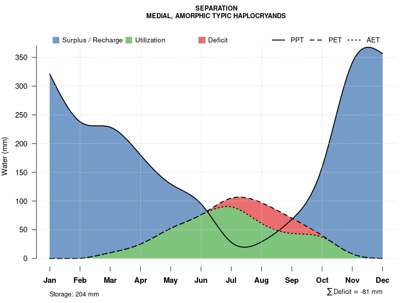 Monthly water balance estimated using a leaky-bucket style model for the SEPARATION soil series. Monthly precipitation (PPT) and potential evapotranspiration (PET) have been estimated from the 50th percentile of gridded values (PRISM 1981-2010) overlapping with the extent of SSURGO map units containing each series as a major component. Monthly PET values were estimated using the method of Thornthwaite (1948). These (and other) climatic parameters are calculated with each SSURGO refresh and provided by the fetchOSD function of the soilDB package. Representative water storage values (“AWC” in the figures) were derived from SSURGO by taking the 50th percentile of profile-total water storage (sum[awc_r * horizon thickness]) for each soil series. Note that this representation of “water storage” is based on the average ability of most plants to extract soil water between 15 bar (“permanent wilting point”) and 1/3 bar (“field capacity”) matric potential. Soil moisture state can be roughly interpreted as “dry” when storage is depleted, “moist” when storage is between 0mm and AWC, and “wet” when there is a surplus. Clearly there are a lot of assumptions baked into this kind of monthly water balance. This is still a work in progress.