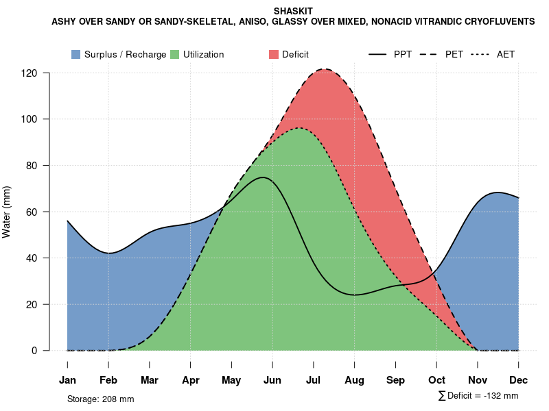 Monthly water balance estimated using a leaky-bucket style model for the SHASKIT soil series. Monthly precipitation (PPT) and potential evapotranspiration (PET) have been estimated from the 50th percentile of gridded values (PRISM 1981-2010) overlapping with the extent of SSURGO map units containing each series as a major component. Monthly PET values were estimated using the method of Thornthwaite (1948). These (and other) climatic parameters are calculated with each SSURGO refresh and provided by the fetchOSD function of the soilDB package. Representative water storage values (“AWC” in the figures) were derived from SSURGO by taking the 50th percentile of profile-total water storage (sum[awc_r * horizon thickness]) for each soil series. Note that this representation of “water storage” is based on the average ability of most plants to extract soil water between 15 bar (“permanent wilting point”) and 1/3 bar (“field capacity”) matric potential. Soil moisture state can be roughly interpreted as “dry” when storage is depleted, “moist” when storage is between 0mm and AWC, and “wet” when there is a surplus. Clearly there are a lot of assumptions baked into this kind of monthly water balance. This is still a work in progress.