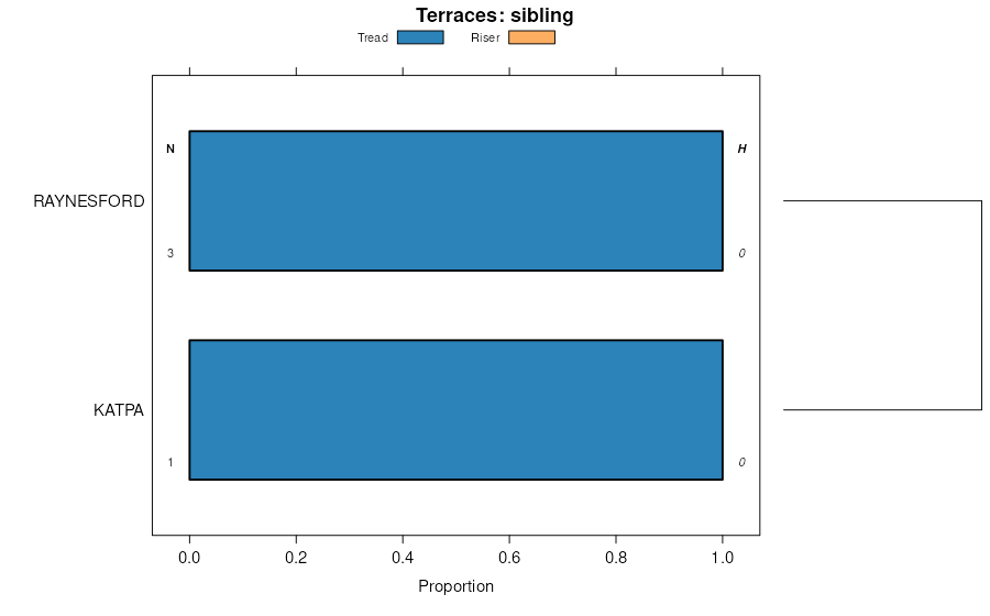 Geomorphic description summaries for the SHEEGE series and siblings. Series are sorted according to hierarchical clustering of proportions and relative hydrologic position within an idealized landform (e.g. top to bottom). Most soil series (SSURGO components) are associated with a hillslope position and one or more landform-specific positions: hills, mountain slopes, terraces, and/or flats. Proportions can be interpreted as an aggregate representation of geomorphic membership. The values printed to the left (number of component records) and right (Shannon entropy) of stacked bars can be used to judge the reliability of trends. Small Shannon entropy values suggest relatively consistent geomorphic association, while larger values suggest lack thereof. Source: SSURGO component records .