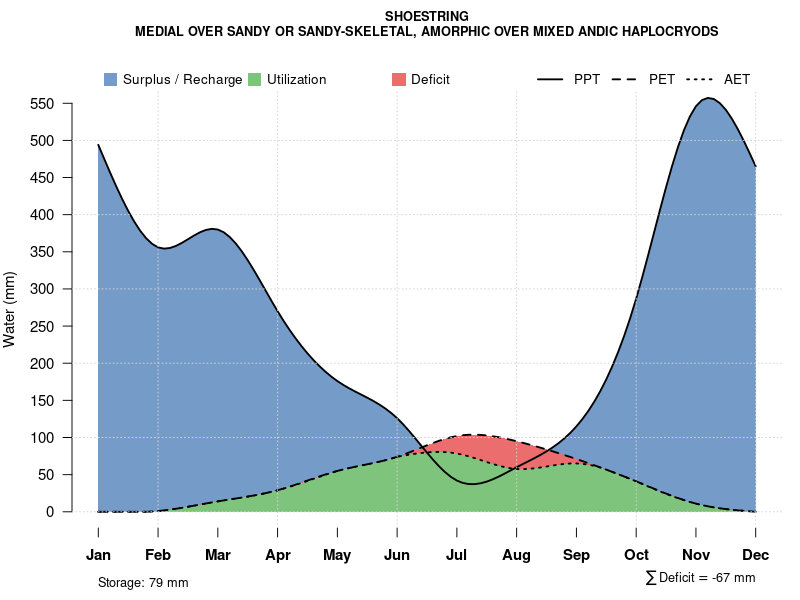 Monthly water balance estimated using a leaky-bucket style model for the SHOESTRING soil series. Monthly precipitation (PPT) and potential evapotranspiration (PET) have been estimated from the 50th percentile of gridded values (PRISM 1981-2010) overlapping with the extent of SSURGO map units containing each series as a major component. Monthly PET values were estimated using the method of Thornthwaite (1948). These (and other) climatic parameters are calculated with each SSURGO refresh and provided by the fetchOSD function of the soilDB package. Representative water storage values (“AWC” in the figures) were derived from SSURGO by taking the 50th percentile of profile-total water storage (sum[awc_r * horizon thickness]) for each soil series. Note that this representation of “water storage” is based on the average ability of most plants to extract soil water between 15 bar (“permanent wilting point”) and 1/3 bar (“field capacity”) matric potential. Soil moisture state can be roughly interpreted as “dry” when storage is depleted, “moist” when storage is between 0mm and AWC, and “wet” when there is a surplus. Clearly there are a lot of assumptions baked into this kind of monthly water balance. This is still a work in progress.