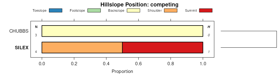 Geomorphic description summaries for the SILEX series and competing. Series are sorted according to hierarchical clustering of proportions and relative hydrologic position within an idealized landform (e.g. top to bottom). Proportions can be interpreted as an aggregate representation of geomorphic membership. Most soil series (SSURGO components) are associated with a hillslope position and one or more landform-specific positions: hills, mountain slopes, terraces, and/or flats. The values printed to the left (number of component records) and right (Shannon entropy) of stacked bars can be used to judge the reliability of trends. Shannon entropy values close to 0 represent soil series with relatively consistent geomorphic association, while values close to 1 suggest lack thereof. Source: SSURGO component records .